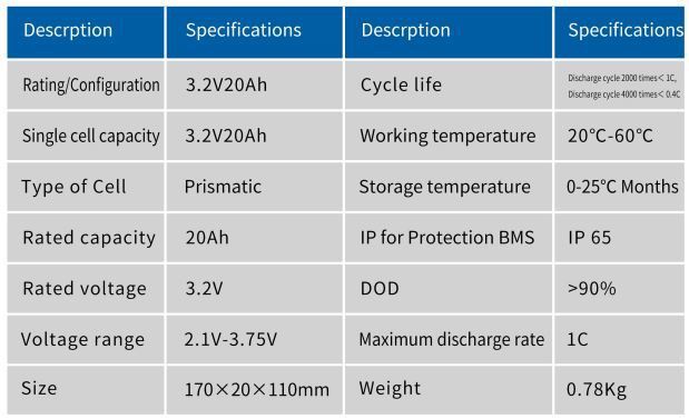 | Mô hình | 32650 | Chu kỳ cuộc sống | Chu kỳ xả 2000 lần < 1C, Chu kỳ xả 4000 lần < 0,4C. |